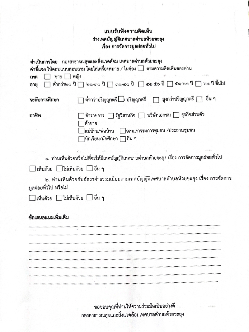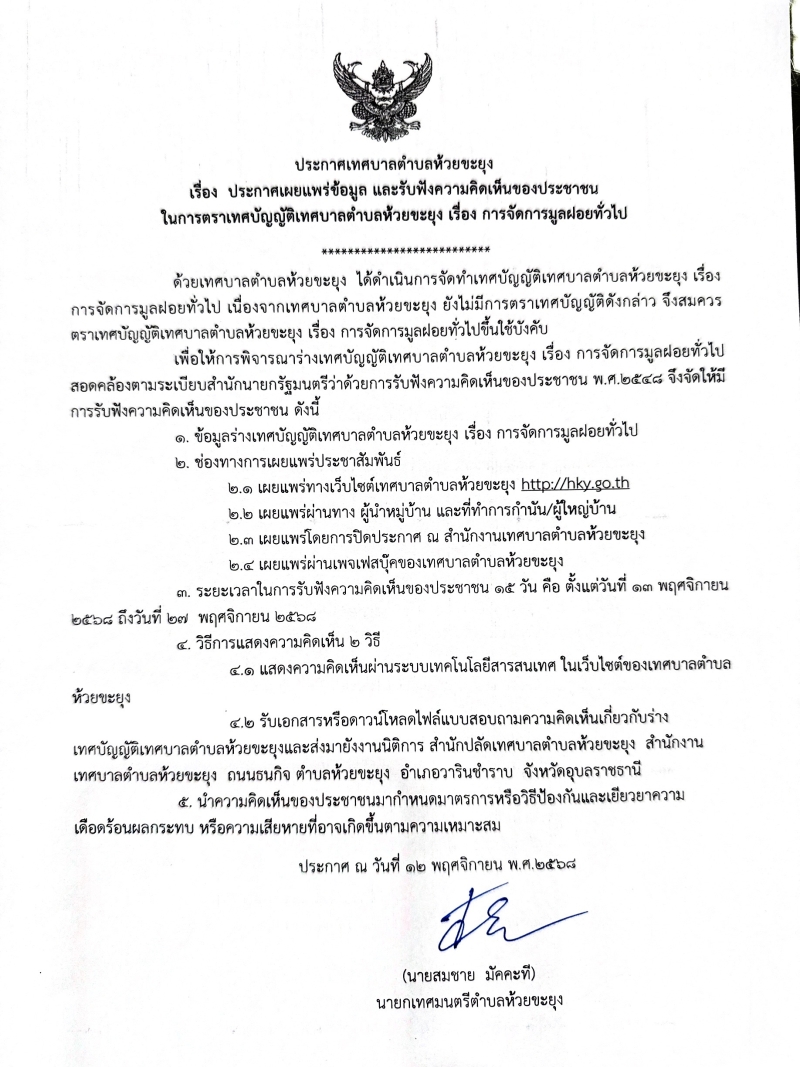 ประกาศฯ เรื่อง ประกาศเผยแพร่ข้อมูล และรับฟังความคิดเห็นของประชาชน ในการตราเทศบัญญัติเทศบาลตำบลห้วยขะยุง เรื่อง การจัดการมูลฝอยทั่วไป