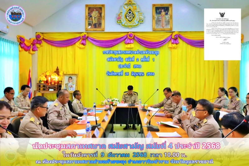ประกาศฯ เรื่อง นัดประชุมสภาเทศบาล สมัยสามัญ สมัยที่ 4 ประจำปี 2568 ในวันอังคารที่ 9 ธันวาคม 2568 เวลา 10.00 น. ณ ห้องประชุมสภาเทศบาลตำบลห้วยขะยุง อำเภอวารินชำราบ จังหวัดอุบลราชธานี
