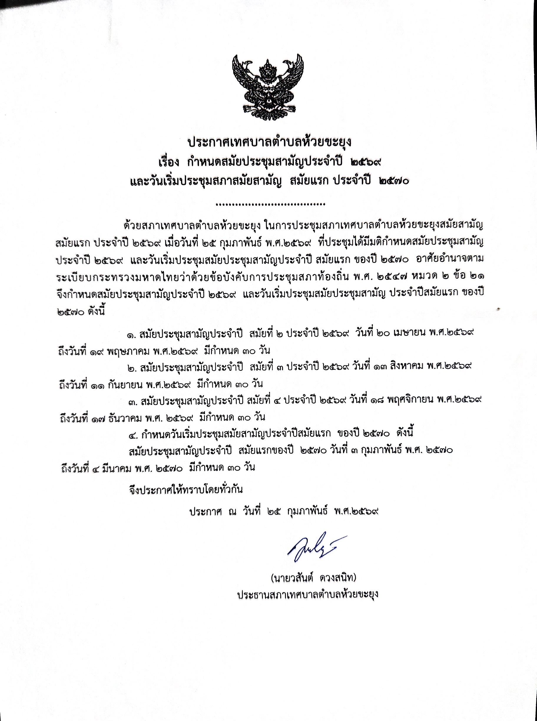 หัวข้อ :: ประกาศเทศบาลตำบลห้วยขะยุง เรื่อง กำหนดสมัยประชุมสามัญประจำปี 2569